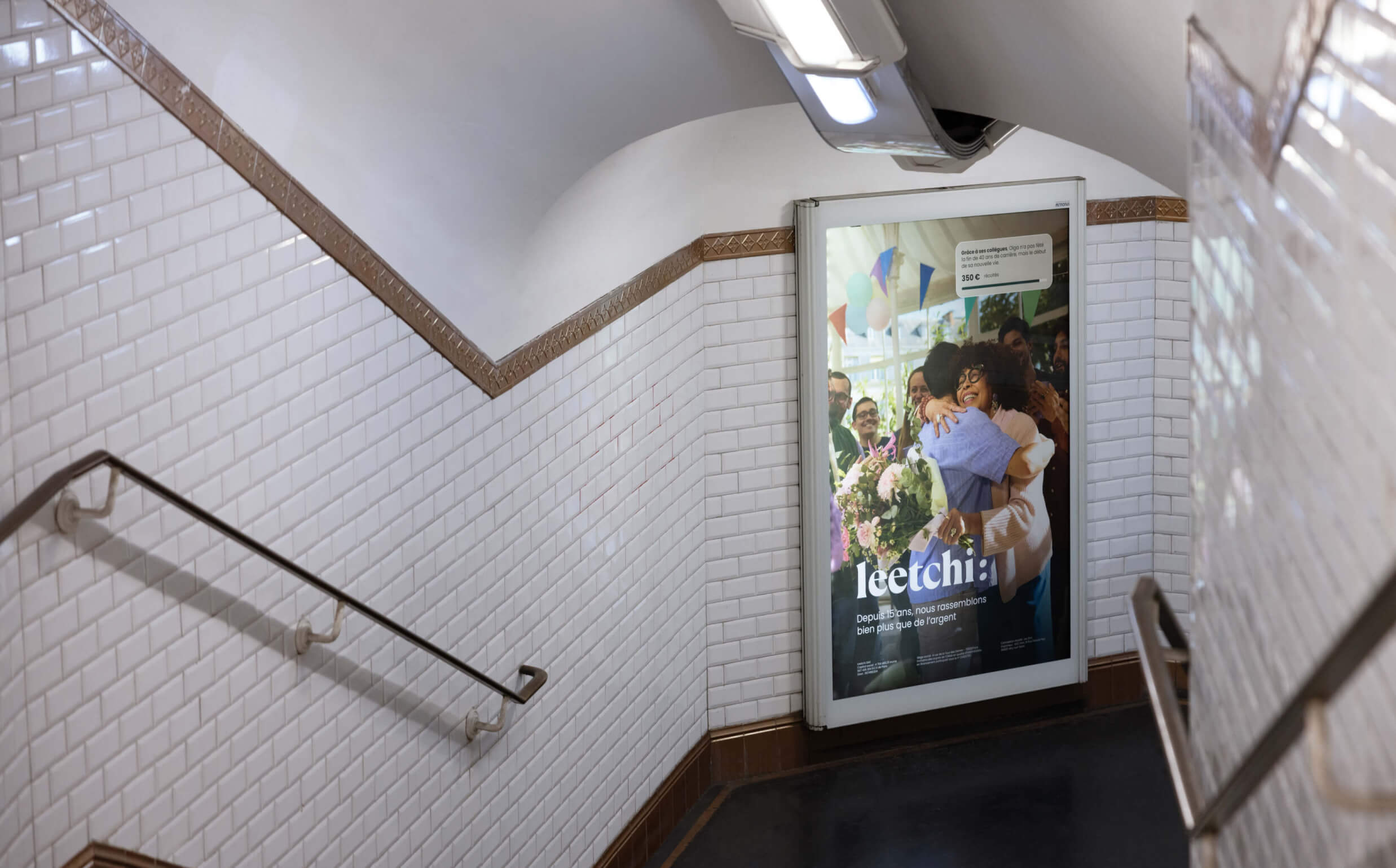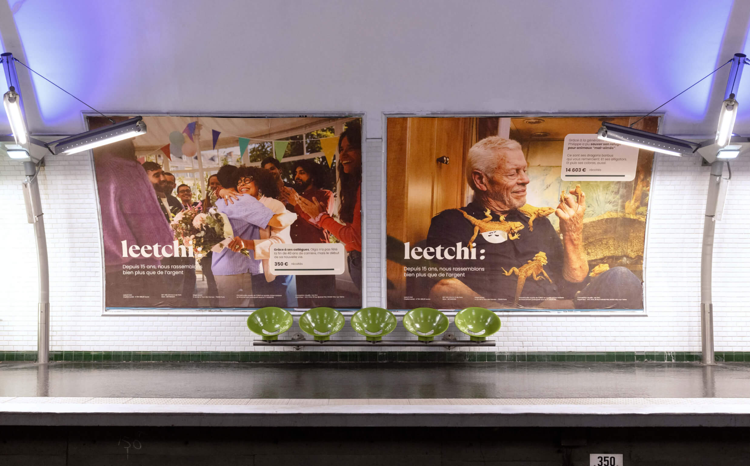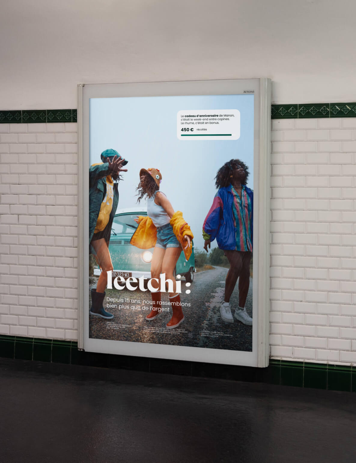 Pionnier français de la cagnotte en ligne en 2009, Leetchi est une marque qui a beaucoup évolué depuis sa création. De site web dédié aux cagnottes festives, Leetchi est devenue une plateforme performante désormais ouverte aux cagnottes solidaires, qui représentent aujourd’hui une part importante de son activité.En 2024, les 15 ans de la marque étaient donc l’occasion de communiquer son nouveau positionnement auprès du grand public, tout en réaffirmant sa position de leader historique.Nous avons fait le choix d’une campagne iconique, inspirante et épurée, racontant les belles histoires rendues possibles par Leetchi et ses millions d’utilisateurs à travers 15 années d’existence.Nous avons sélectionné 5 cagnottes emblématiques, illustrant 5 thématiques importantes chez Leetchi (cause animale, défense de l’environnement, élan solidaire, pot de départ, anniversaire) et autant de moments de vie différents.En plaçant l’humain et les émotions au coeur du récit, l’enjeu était de traduire le pouvoir de la solidarité et la force du collectif, deux valeurs essentielles de la marque Leetchi.Chacune des 5 cagnottes a été mise en valeur grâce à des visuels prints immersifs, ainsi qu’une série de courts-métrages destinés aux écrans DOOH et à une large diffusion sur le digital.La campagne nationale s’est affichée tout au long de novembre sur 2 017 écrans dans le métro parisien et à l’arrière des bus du réseau francilien, 410 écrans numériques dans les principales gares de France (Paris, Lyon, Bordeaux, Toulouse et Lille), ainsi que sur les réseaux sociaux, Youtube et Tead.