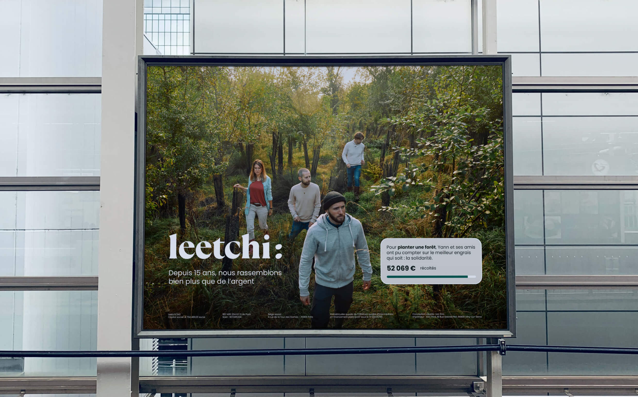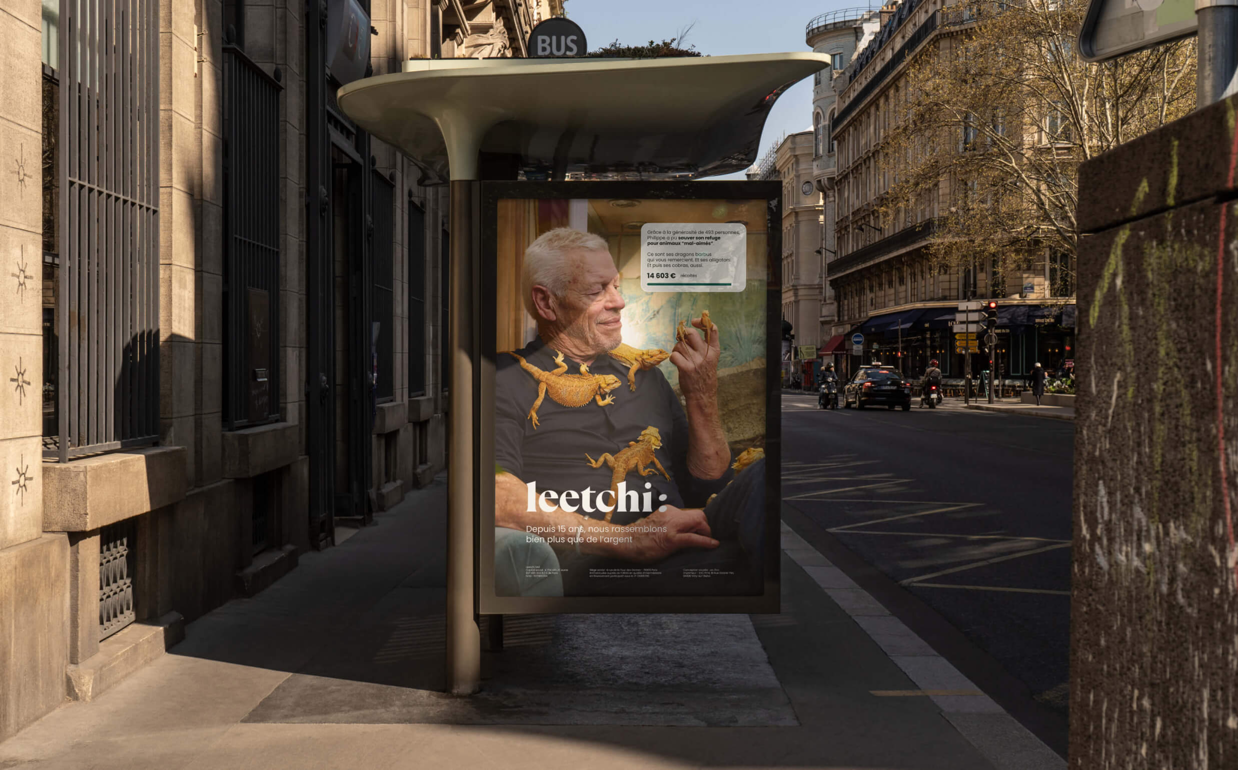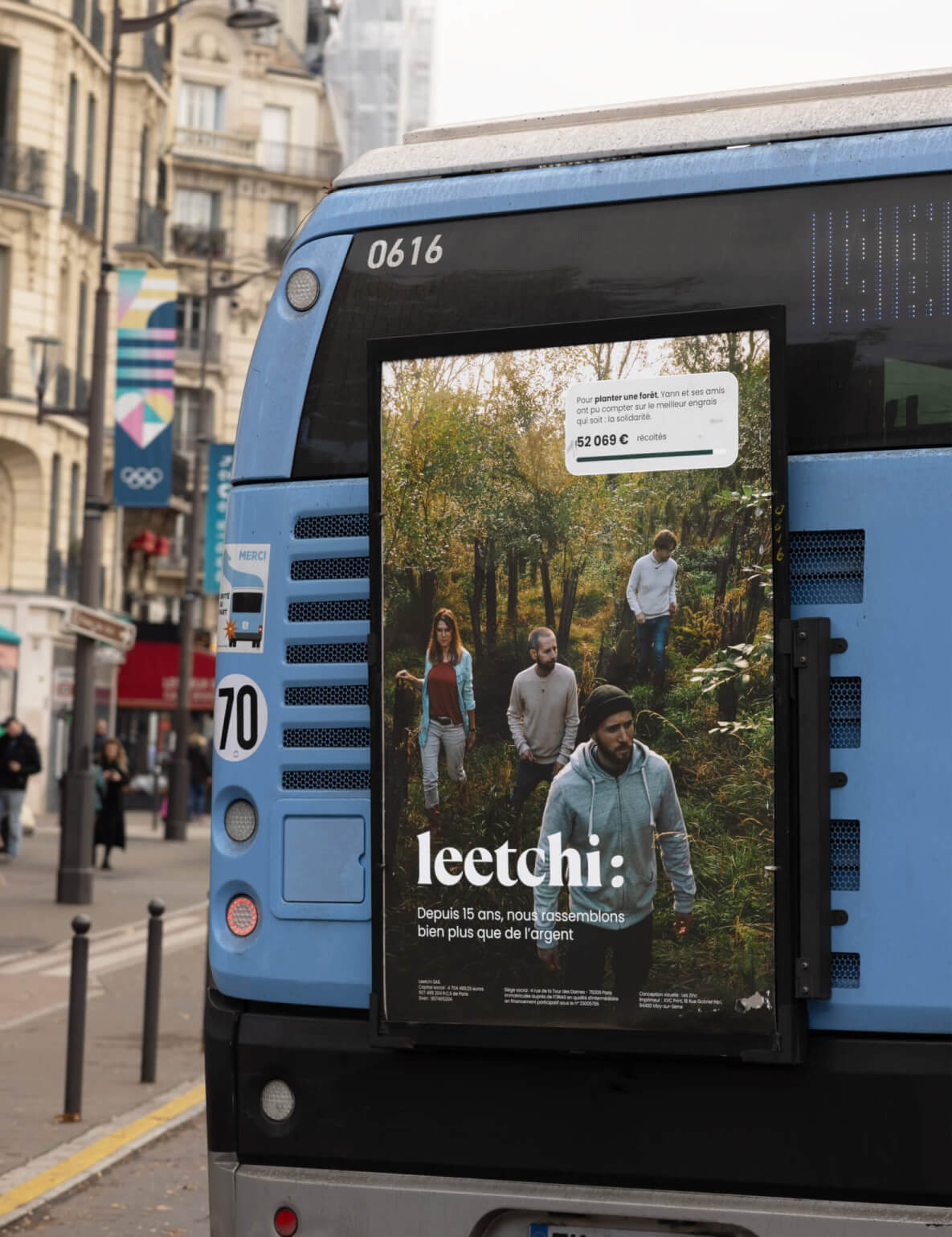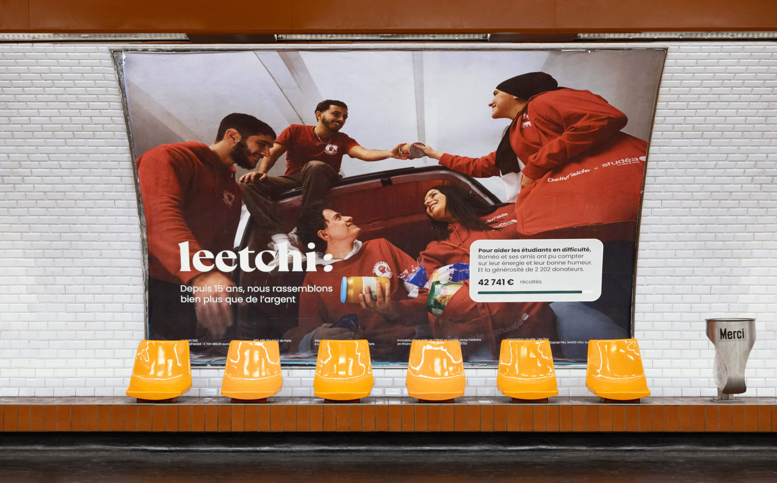 Pionnier français de la cagnotte en ligne en 2009, Leetchi est une marque qui a beaucoup évolué depuis sa création. De site web dédié aux cagnottes festives, Leetchi est devenue une plateforme performante désormais ouverte aux cagnottes solidaires, qui représentent aujourd’hui une part importante de son activité.En 2024, les 15 ans de la marque étaient donc l’occasion de communiquer son nouveau positionnement auprès du grand public, tout en réaffirmant sa position de leader historique.Nous avons fait le choix d’une campagne iconique, inspirante et épurée, racontant les belles histoires rendues possibles par Leetchi et ses millions d’utilisateurs à travers 15 années d’existence.Nous avons sélectionné 5 cagnottes emblématiques, illustrant 5 thématiques importantes chez Leetchi (cause animale, défense de l’environnement, élan solidaire, pot de départ, anniversaire) et autant de moments de vie différents.En plaçant l’humain et les émotions au coeur du récit, l’enjeu était de traduire le pouvoir de la solidarité et la force du collectif, deux valeurs essentielles de la marque Leetchi.Chacune des 5 cagnottes a été mise en valeur grâce à des visuels prints immersifs, ainsi qu’une série de courts-métrages destinés aux écrans DOOH et à une large diffusion sur le digital.La campagne nationale s’est affichée tout au long de novembre sur 2 017 écrans dans le métro parisien et à l’arrière des bus du réseau francilien, 410 écrans numériques dans les principales gares de France (Paris, Lyon, Bordeaux, Toulouse et Lille), ainsi que sur les réseaux sociaux, Youtube et Tead.